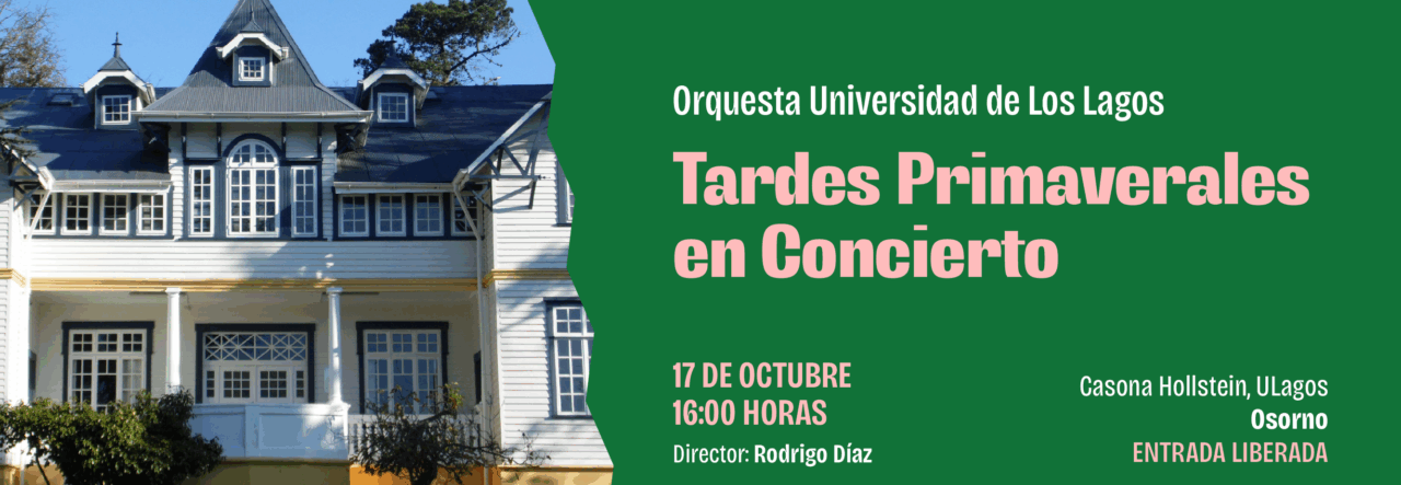 Este viernes 17 de octubre, la Orquesta de la Universidad de Los Lagos se presentará en los jardines de la Casona Hollstein (Guillermo Hollstein 3, Osorno) con un imperdible concierto titulado “Tardes Primaverales”. Un homenaje a la riqueza musical del continente, interpretado por jóvenes talentos universitarios.