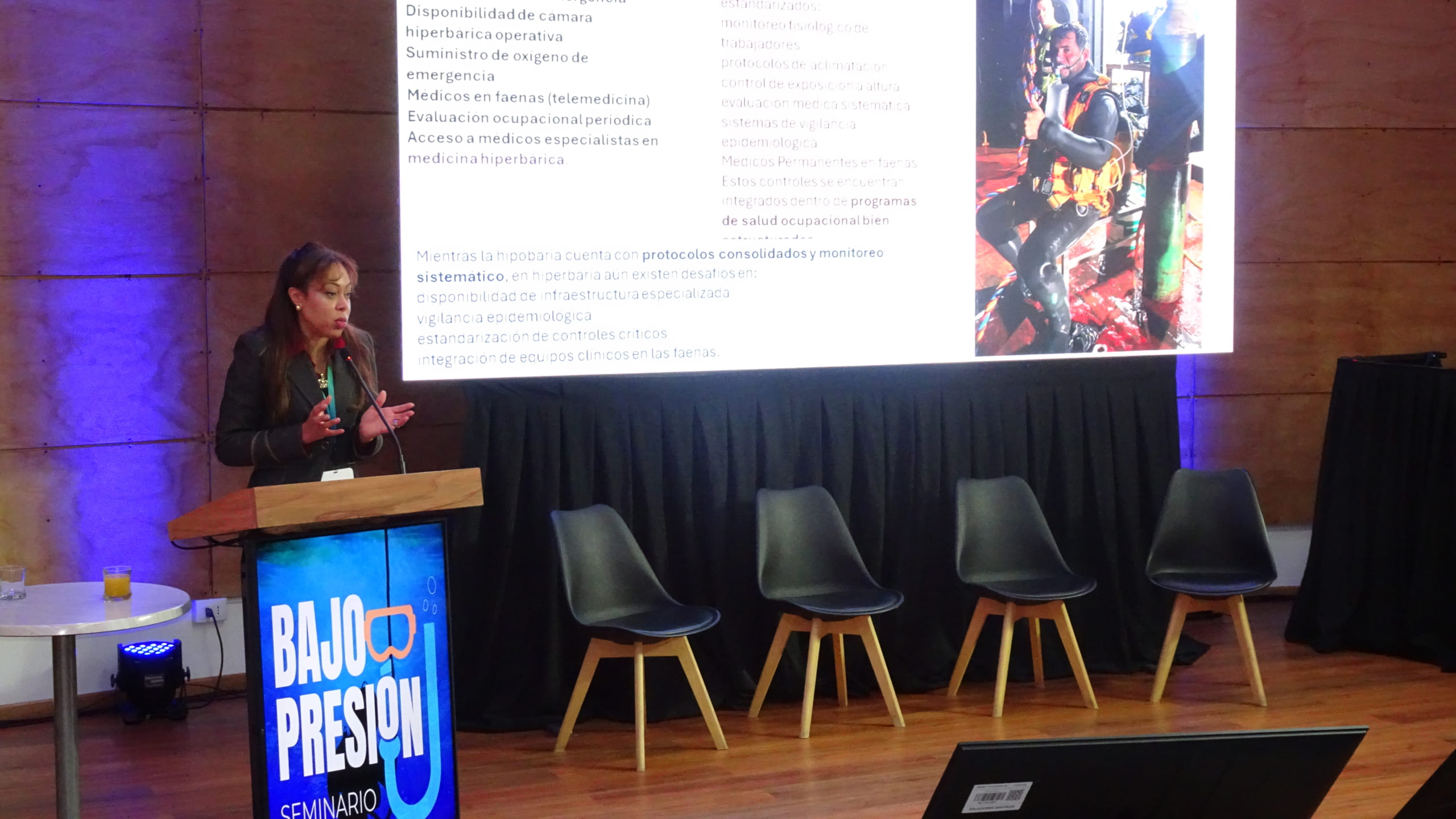 La charla magistral estuvo a cargo de la doctora Tania Capote González,  médica cirujana por la Universidad de Chile, especialista en medicina interna y salud ocupacional. La especialista en hiperbaria apuntó a la función de la Universidad de Los Lagos en torno a esta materia. “Estamos en este seminario porque queremos contribuir al desarrollo de la medicina hiperbárica, contando con el apoyo de la Universidad de los lagos y de los gremios del buceo, porque de acuerdo a las nuevas leyes  muy pronto se requerirá la formación de especialistas en el área hiperbárica. Estamos hablando de médicos, enfermeros, operadores de cámara, asistentes y en eso, la universidad tiene un papel certificador muy importante. También quisimos hablar de los riesgos ocupacionales, sobre cómo gestionarlos de buena manera para disminuir la siniestralidad y la mortalidad, implementando buenas técnicas de trabajo y mejorando la gestión del buceo día a día”, enfatizó la doctora  Capote.